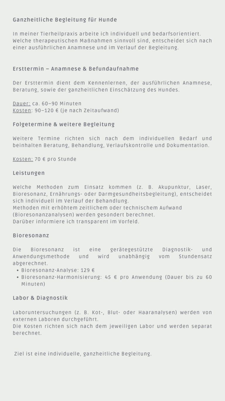 Preise So wie jedes Tier, ist auch jede Erkrankung individuell. Die Berechnung meiner erbrachten Leistungen, erfolgt nach Vorgabe des Gebührenverzeichnisses für Tierheilpraktiker. (Stand 02/2026)